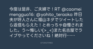今度は是非、ご夫婦で!RT @caomeimengguo16: @yohito_teraoka 昨日夫が呼人さんに福山ネタでツイートしたら返信もらえた!とめっちゃ自慢されました。う〜悔しい(>_<)また名古屋でライブやってくださいね!絶対行きます〜♪