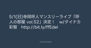 5/1(日)寺岡呼人マンスリーライブ「呼人の部屋 vol.52」決定! w/タイナカ彩智 http://bit.ly/ffEdeI