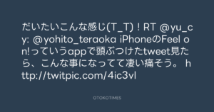 だいたいこんな感じ(T_T)!RT @yu_cy: @yohito_teraoka iPhoneのFeel on!っていうappで頭ぶつけたtweet見たら、こんな事になってて凄い痛そう。 http://twitpic.com/4ic3vl