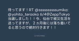 待ってます!RT @ssssssssssumika: @yohito_teraoka 6/4@ZeppTokyo当選しました!!今、仙台で被災生活を送ってますが、2ヵ月後には落ち着いてると思うので絶対行きます!!