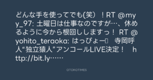 どんな手を使ってでも(笑)!RT @myy_97: 土曜日は仕事なのですが…、休めるように今から根回ししますっ! RT @yohito_teraoka: はっぴょー♪ 寺岡呼人“独立猿人”アンコールLIVE決定! http://bit.ly/feuSqi