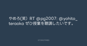 寺岡呼人 @yohito_teraoka – 21:16・2011年4月23日 2011 4/23 寺岡呼人 2011-04-23 やめろ(笑)RT @pg2007: @yohito_teraoka ぜひ授業を聴講したいです。 Source:https://x.com/yohito_teraoka/status/61765268006... text X Post 寺岡呼人 寺岡呼人 この記事が気に入ったら フォローしてね! Follow @OtokoTimes1988 よかったらシェアしてね! URLをコピーしました! 寺岡呼人 @yohito_teraoka - 21:14・2011年4月23日 青山英樹 @aoyama_hideki - 21:16・2011年4月23日 関連記事 Artist 寺岡呼人 1968.02.07