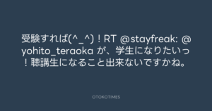 寺岡呼人 @yohito_teraoka – 21:17・2011年4月23日 2011 4/23 寺岡呼人 2011-04-23 受験すれば(^_^)!RT @stayfreak: @yohito_teraoka が、学生になりたいっ!聴講生になること出来ないですかね。 Source:https://x.com/yohito_teraoka/status/61765661529... text X Post 寺岡呼人 寺岡呼人 この記事が気に入ったら フォローしてね! Follow @OtokoTimes1988 よかったらシェアしてね! URLをコピーしました! 寺岡呼人 @yohito_teraoka - 21:16・2011年4月23日 寺岡呼人 @yohito_teraoka - 21:18・2011年4月23日 関連記事 Artist 寺岡呼人 1968.02.07