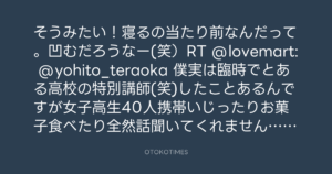 そうみたい!寝るの当たり前なんだって。凹むだろうなー(笑)RT @lovemart: @yohito_teraoka 僕実は臨時でとある高校の特別講師(笑)したことあるんですが女子高生40人携帯いじったりお菓子食べたり全然話聞いてくれませんでした!