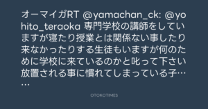 オーマイガRT @yamachan_ck: @yohito_teraoka 専門学校の講師をしていますが寝たり授業とは関係ない事したり来なかったりする生徒もいますが何のために学校に来ているのかと叱って下さい放置される事に慣れてしまっている子供が多い残念な世の中ですが変えられます!