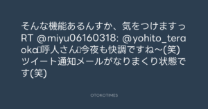 そんな機能あるんすか、気をつけますっRT @miyu06160318: @yohito_teraoka☆呼人さん☆今夜も快調ですね〜(笑)ツイート通知メールがなりまくり状態です(笑)