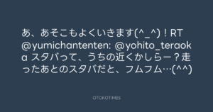 寺岡呼人 @yohito_teraoka – 14:07・2011年4月25日 2011 4/25 寺岡呼人 2011-04-25 あ、あそこもよくいきます(^_^)!RT @yumichantenten: @yohito_teraoka スタバって、うちの近くかしらー?走ったあとのスタバだと、フムフム…(^^) Source:https://x.com/yohito_teraoka/status/62382312154... text X Post 寺岡呼人 寺岡呼人 この記事が気に入ったら フォローしてね! Follow @OtokoTimes1988 よかったらシェアしてね! URLをコピーしました! 寺岡呼人 @yohito_teraoka - 12:57・2011年4月25日 青山英樹 @aoyama_hideki - 11:23・2011年4月26日 関連記事 Artist 寺岡呼人 1968.02.07