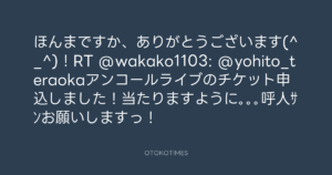 ほんまですか、ありがとうございます(^_^)!RT @wakako1103: @yohito_teraokaアンコールライブのチケット申込しました!当たりますように。。。呼人サンお願いしますっ!