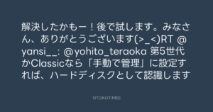 寺岡呼人 @yohito_teraoka – 9:14・2011年4月27日 2011 4/27 寺岡呼人 2011-04-27 解決したかもー!後で試します。みなさん、ありがとうございます(>_<)RT @yansi__: @yohito_teraoka 第5世代かClassicなら「手動で管理」に設定すれば、ハードディスクとして認識します Source:https://x.com/yohito_teraoka/status/63033189588... text X Post 寺岡呼人 寺岡呼人 この記事が気に入ったら フォローしてね! Follow @OtokoTimes1988 よかったらシェアしてね! URLをコピーしました! 寺岡呼人 @yohito_teraoka - 9:12・2011年4月27日 Koyo Maeda @koyomaeda - 9:18・2011年4月27日 関連記事 Artist 寺岡呼人 1968.02.07