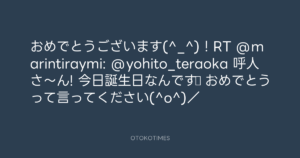 寺岡呼人 @yohito_teraoka – 22:23・2011年5月4日 2011 5/04 寺岡呼人 2011-05-04 おめでとうございます(^_^)!RT @marintiraymi: @yohito_teraoka 呼人さ~ん! 今日誕生日なんです♪ おめでとうって言ってください(^o^)/ Source:https://x.com/yohito_teraoka/status/65768415066... text X Post 寺岡呼人 寺岡呼人 この記事が気に入ったら フォローしてね! Follow @OtokoTimes1988 よかったらシェアしてね! URLをコピーしました! 寺岡呼人 @yohito_teraoka - 20:07・2011年5月4日 Koyo Maeda @koyomaeda - 22:36・2011年5月4日 関連記事 Artist 寺岡呼人 1968.02.07