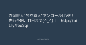 寺岡呼人 @yohito_teraoka – 14:57・2011年5月10日 2011 5/10 寺岡呼人 2011-05-10 寺岡呼人“独立猿人”アンコールLIVE!先行予約、11日まで(^_^)! http://bit.ly/feuSqi Source:https://x.com/yohito_teraoka/status/67830683728... text X Post 寺岡呼人 寺岡呼人 この記事が気に入ったら フォローしてね! Follow @OtokoTimes1988 よかったらシェアしてね! URLをコピーしました! Koyo Maeda @koyomaeda - 14:55・2011年5月10日 Koyo Maeda @koyomaeda - 15:06・2011年5月10日 関連記事 Artist 寺岡呼人 1968.02.07