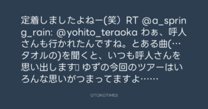 定着しましたよねー(笑)RT @a_spring_rain: @yohito_teraoka わぁ、呼人さんも行かれたんですね。とある曲(…タオルの)を聞くと、いつも呼人さんを思い出します☆ ゆずの今回のツアーはいろんな思いがつまってますよね。