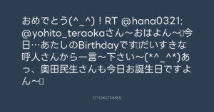おめでとう(^_^)!RT @hana0321: @yohito_teraokaさん〜おはよん〜☆今日…あたしのBirthdayです♪だいすきな呼人さんから一言〜下さい〜(*^_^*)あっ、奥田民生さんも今日お誕生日ですよん〜☆