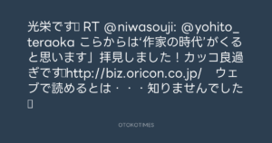 光栄です♪ RT @niwasouji: @yohito_teraoka こらからは‘作家の時代’がくると思います」拝見しました!カッコ良過ぎです♪http://biz.oricon.co.jp/ ウェブで読めるとは・・・知りませんでした☆