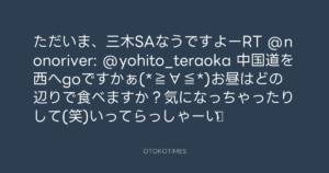 ただいま、三木SAなうですよーRT @nonoriver: @yohito_teraoka 中国道を西へgoですかぁ(*≧∀≦*)お昼はどの辺りで食べますか?気になっちゃったりして(笑)いってらっしゃーい♪