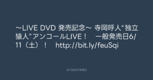 寺岡呼人 @yohito_teraoka – 10:12・2011年5月21日 2011 5/21 寺岡呼人 2011-05-21 〜LIVE DVD 発売記念〜 寺岡呼人“独立猿人”アンコールLIVE! 一般発売日6/11(土)! http://bit.ly/feuSqi Source:https://x.com/yohito_teraoka/status/71745254323... text X Post 寺岡呼人 寺岡呼人 この記事が気に入ったら フォローしてね! Follow @OtokoTimes1988 よかったらシェアしてね! URLをコピーしました! Koyo Maeda @koyomaeda - 8:23・2011年5月21日 Koyo Maeda @koyomaeda - 12:01・2011年5月21日 関連記事 Artist 寺岡呼人 1968.02.07