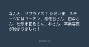 なんと、サプライズ! ただいま、ステージにはユーミン、松任谷さん、田中さん、松原市正樹さん、林さん、卒業写真が始まりました!