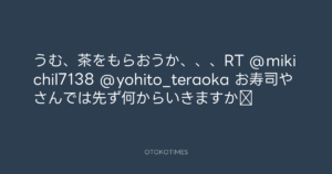 うむ、茶をもらおうか、、、RT @mikichil7138 @yohito_teraoka お寿司やさんでは先ず何からいきますか⁇