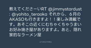 教えてくださーいRT @jimmystardust: @yohito_teraoka それから、6月のAKASOも行きますよ!!楽しみ満載です。あそこの近くにむちゃくちゃうまいお好み焼き屋がありますよ。あと、隠れ家的なラーメン屋
