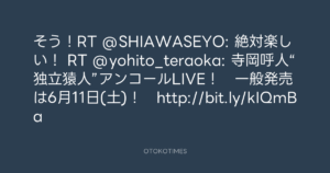寺岡呼人 @yohito_teraoka – 13:00・2011年6月8日 2011 6/08 寺岡呼人 2011-06-08 そう!RT @SHIAWASEYO: 絶対楽しい! RT @yohito_teraoka: 寺岡呼人“独立猿人”アンコールLIVE! 一般発売は6月11日(土)! http://bit.ly/kIQmBa Source:https://x.com/yohito_teraoka/status/78310340173... text X Post 寺岡呼人 寺岡呼人 この記事が気に入ったら フォローしてね! Follow @OtokoTimes1988 よかったらシェアしてね! URLをコピーしました! 寺岡呼人 @yohito_teraoka - 12:31・2011年6月8日 青山英樹 @aoyama_hideki - 14:04・2011年6月8日 関連記事 Artist 寺岡呼人 1968.02.07