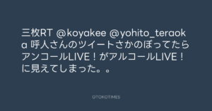 寺岡呼人 @yohito_teraoka – 0:13・2011年6月9日 2011 6/09 寺岡呼人 2011-06-09 三枚RT @koyakee @yohito_teraoka 呼人さんのツイートさかのぼってたらアンコールLIVE!がアルコールLIVE!に見えてしまった。。 Source:https://x.com/yohito_teraoka/status/78479879615... text X Post 寺岡呼人 寺岡呼人 この記事が気に入ったら フォローしてね! Follow @OtokoTimes1988 よかったらシェアしてね! URLをコピーしました! 寺岡呼人 @yohito_teraoka - 23:52・2011年6月8日 寺岡呼人 @yohito_teraoka - 0:14・2011年6月9日 関連記事 Artist 寺岡呼人 1968.02.07