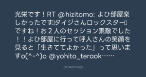 光栄です!RT @hizitomo: よひ部屋楽しかったです♪タイジさんロックスター☆ですね!お2人のセッション素敵でした!!よひ部屋に行って呼人さんの笑顔を見ると「生きててよかった」って思いますo(^-^)o @yohito_teraoka