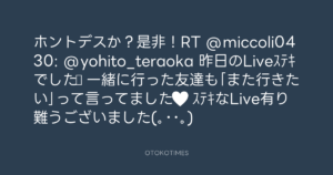 寺岡呼人 @yohito_teraoka – 11:14・2011年6月20日 2011 6/20 寺岡呼人 2011-06-20 ホントデスか?是非!RT @miccoli0430: @yohito_teraoka 昨日のLiveステキでした♬ 一緒に行った友達も「また行きたい」って言ってました♥ ステキなLive有り難うございました(。・・。) Source:https://x.com/yohito_teraoka/status/82632481446... text X Post 寺岡呼人 寺岡呼人 この記事が気に入ったら フォローしてね! Follow @OtokoTimes1988 よかったらシェアしてね! URLをコピーしました! Koyo Maeda @koyomaeda - 9:15・2011年6月20日 Koyo Maeda @koyomaeda - 12:07・2011年6月20日 関連記事 Artist 寺岡呼人 1968.02.07