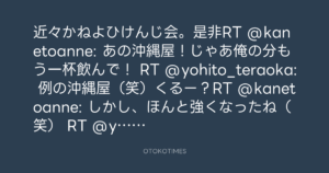 近々かねよひけんじ会。是非RT @kanetoanne: あの沖縄屋!じゃあ俺の分もう一杯飲んで! RT @yohito_teraoka: 例の沖縄屋(笑)くるー?RT @kanetoanne: しかし、ほんと強くなったね(笑) RT @yohito_teraoka: !