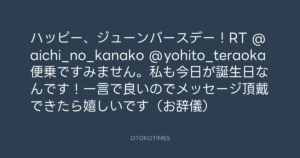 寺岡呼人 @yohito_teraoka – 20:40・2011年6月26日 2011 6/26 寺岡呼人 2011-06-26 ハッピー、ジューンバースデー!RT @aichi_no_kanako @yohito_teraoka 便乗ですみません。私も今日が誕生日なんです!一言で良いのでメッセージ頂戴できたら嬉しいです(お辞儀) Source:https://x.com/yohito_teraoka/status/84949104823... text X Post 寺岡呼人 寺岡呼人 この記事が気に入ったら フォローしてね! Follow @OtokoTimes1988 よかったらシェアしてね! URLをコピーしました! Koyo Maeda @koyomaeda - 20:03・2011年6月26日 寺岡呼人 @yohito_teraoka - 20:59・2011年6月26日 関連記事 Artist 寺岡呼人 1968.02.07