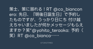 策士、策に溺れる!RT @co_bianconero: 先日、『明後日誕生日』で予約したものですが、うっかり日にち 付け越えちゃいましたが何かメッセージもらえますか?笑“@yohito_teraoka: 予約(笑)RT @co_bianconero: ボクは明後日誕生日です。