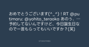 おめでとうございます(^_^)!RT @putimaru: @yohito_teraoka あのぅ、…予約してないんですけど、今日誕生日なので一言もらってもいいですか?(笑)
