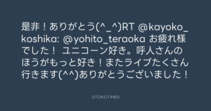 是非!ありがとう(^_^)RT @kayoko_koshika: @yohito_teraoka お疲れ様でした! ユニコーン好き。呼人さんのほうがもっと好き!またライブたくさん行きます(^^)ありがとうございました!