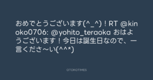 寺岡呼人 @yohito_teraoka – 12:31・2011年7月6日 2011 7/06 寺岡呼人 2011-07-06 おめでとうございます(^_^)!RT @kinoko0706: @yohito_teraoka おはようございます!今日は誕生日なので、一言くださ~い(^^*) Source:https://x.com/yohito_teraoka/status/88450078225... text X Post 寺岡呼人 寺岡呼人 この記事が気に入ったら フォローしてね! Follow @OtokoTimes1988 よかったらシェアしてね! URLをコピーしました! Koyo Maeda @koyomaeda - 11:33・2011年7月6日 Koyo Maeda @koyomaeda - 12:42・2011年7月6日 関連記事 Artist 寺岡呼人 1968.02.07