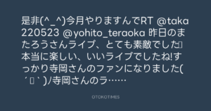 是非(^_^)今月やりますんでRT @taka220523 @yohito_teraoka 昨日のまたろうさんライブ、とても素敵でした♡ 本当に楽しい、いいライブでしたね!すっかり寺岡さんのファンになりました( ´ ▽ ` )ノ寺岡さんのライブも行ってみたいです♪