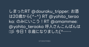 しまったRT @douraku_tripper: お酒は20歳から(^-^) RT @yohito_teraoka: のみにいこう!RT @amammee: @yohito_teraoka 呼人さんこんばんは☆彡 今日18歳になりました(^^) 一言お願いします(*> <*)!