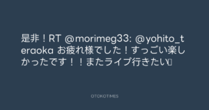 寺岡呼人 @yohito_teraoka – 0:50・2011年7月18日 2011 7/18 寺岡呼人 2011-07-18 是非!RT @morimeg33: @yohito_teraoka お疲れ様でした!すっごい楽しかったです!!またライブ行きたい♪ Source:https://x.com/yohito_teraoka/status/92622208073... text X Post 寺岡呼人 寺岡呼人 この記事が気に入ったら フォローしてね! Follow @OtokoTimes1988 よかったらシェアしてね! URLをコピーしました! 寺岡呼人 @yohito_teraoka - 0:50・2011年7月18日 寺岡呼人 @yohito_teraoka - 0:50・2011年7月18日 関連記事 Artist 寺岡呼人 1968.02.07