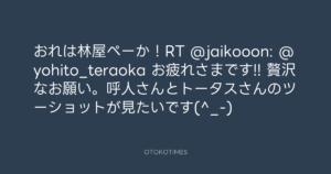寺岡呼人 @yohito_teraoka – 0:53・2011年7月18日 2011 7/18 寺岡呼人 2011-07-18 おれは林屋ぺーか!RT @jaikooon: @yohito_teraoka お疲れさまです!! 贅沢なお願い。呼人さんとトータスさんのツーショットが見たいです(^_-) Source:https://x.com/yohito_teraoka/status/92623050029... text X Post 寺岡呼人 寺岡呼人 この記事が気に入ったら フォローしてね! Follow @OtokoTimes1988 よかったらシェアしてね! URLをコピーしました! 寺岡呼人 @yohito_teraoka - 0:52・2011年7月18日 寺岡呼人 @yohito_teraoka - 0:54・2011年7月18日 関連記事 Artist 寺岡呼人 1968.02.07