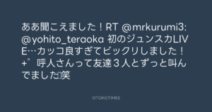 寺岡呼人 @yohito_teraoka – 1:00・2011年7月18日 2011 7/18 寺岡呼人 2011-07-18 ああ聞こえました!RT @mrkurumi3: @yohito_teraoka 初のジュンスカLIVE…カッコ良すぎてビックリしました!+゜呼人さんって友達3人とずっと叫んでました☆笑 Source:https://x.com/yohito_teraoka/status/92624622712... text X Post 寺岡呼人 寺岡呼人 この記事が気に入ったら フォローしてね! Follow @OtokoTimes1988 よかったらシェアしてね! URLをコピーしました! 寺岡呼人 @yohito_teraoka - 0:54・2011年7月18日 寺岡呼人 @yohito_teraoka - 1:00・2011年7月18日 関連記事 Artist 寺岡呼人 1968.02.07