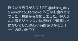 遠くからありがとう!RT @chiro_dayo @yohito_teraoka 昨日はお疲れさまでした!福島から参加しました。呼人さんの居るジュンスカは初めてで興奮しっぱなしでした♪楽しい時間ありがとう!一生の想い出です!