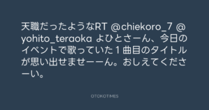 寺岡呼人 @yohito_teraoka – 21:05・2011年7月18日 2011 7/18 寺岡呼人 2011-07-18 天職だったようなRT @chiekoro_7 @yohito_teraoka よひとさーん、今日のイベントで歌っていた1曲目のタイトルが思い出せませーーん。おしえてくださーい。 Source:https://x.com/yohito_teraoka/status/92928014639... text X Post 寺岡呼人 寺岡呼人 この記事が気に入ったら フォローしてね! Follow @OtokoTimes1988 よかったらシェアしてね! URLをコピーしました! 寺岡呼人 @yohito_teraoka - 21:05・2011年7月18日 寺岡呼人 @yohito_teraoka - 21:33・2011年7月18日 関連記事 Artist 寺岡呼人 1968.02.07