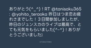 ありがとう(^_^)!RT @tanisaku365: @yohito_teraoka 昨日はつま恋お疲れさまでした!3日間参加しましたが、昨日のジュンスカのライブは最高で、とても元気をもらいました(^-^)!ありがとうございました☆