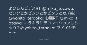よひしんごデスRT @mika_tazawa: ピンクとかピンクとかピンクとか♡ (笑) @yohito_teraoka: お願RT @mika_tazawa: キラキラにデコレーションしちゃう?@yohito_teraoka: マイイヤモニhttp://moby.to/tcmili