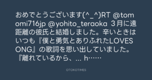 おめでとうございます(^_^)RT @tomomi716jp @yohito_teraoka 3月に遠距離の彼氏と結婚しました。辛いときはいつも『僕と勇気とありふれたLOVESONG』の歌詞を思い出していました。『離れているから、… http://tl.gd/c8k00d