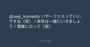 寺岡呼人 @yohito_teraoka – 14:28・2011年8月15日 2011 8/15 寺岡呼人 2011-08-15 @seiji_kameda いやーフェスっていいですね(笑)!来年は一緒にいきましょう!電車にのって(笑) Source:https://x.com/yohito_teraoka/status/10297503580... text X Post 寺岡呼人 寺岡呼人 この記事が気に入ったら フォローしてね! Follow @OtokoTimes1988 よかったらシェアしてね! URLをコピーしました! 寺岡呼人 @yohito_teraoka - 13:39・2011年8月15日 Koyo Maeda @koyomaeda - 16:05・2011年8月15日 関連記事 Artist 寺岡呼人 1968.02.07