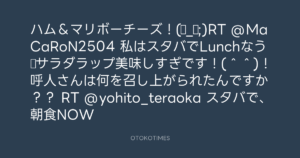 ハム&マリボーチーズ!(◎_◎;)RT @MaCaRoN2504 私はスタバでLunchなう☆サラダラップ美味しすぎです!(^^)!呼人さんは何を召し上がられたんですか?? RT @yohito_teraoka スタバで、朝食NOW