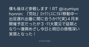 僕も後ほど参戦します!RT @izumiyahonnin: 『荒吐』ロックフェスにクルマ移動中〜出足遅れ出番に間に合うか!?(笑)4月末開催予定だったが3・11大震災で延期となり〜復興めざし今日と明日の感慨深い実現となった!