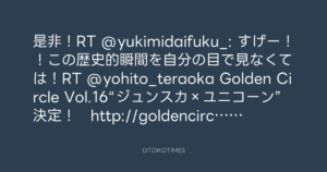 是非!RT @yukimidaifuku_: すげー!!この歴史的瞬間を自分の目で見なくては!RT @yohito_teraoka Golden Circle Vol.16“ジュンスカ×ユニコーン”決定! http://goldencircle.jp/