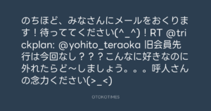 のちほど、みなさんにメールをおくります!待っててください(^_^)!RT @trickplan: @yohito_teraoka 旧会員先行は今回なし???こんなに好きなのに外れたらど~しましょう。。。呼人さんの念力ください(>_<)