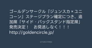 寺岡呼人 @yohito_teraoka – 18:25・2011年9月11日 2011 9/11 寺岡呼人 2011-09-11 ゴールデンサークル『ジュンスカ×ユニコーン』ステージプラン確定につき、追加席「サイド・バックスタンド指定席」発売決定! お見逃しなく!!! http://goldencircle.jp/ Source:https://x.com/yohito_teraoka/status/11281902942... text X Post 寺岡呼人 寺岡呼人 この記事が気に入ったら フォローしてね! Follow @OtokoTimes1988 よかったらシェアしてね! URLをコピーしました! Koyo Maeda @koyomaeda - 9:22・2011年9月11日 寺岡呼人 @yohito_teraoka - 19:34・2011年9月11日 関連記事 Artist 寺岡呼人 1968.02.07