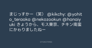 寺岡呼人 @yohito_teraoka – 18:01・2011年9月16日 2011 9/16 寺岡呼人 2011-09-16 まじっすかー(笑) @kikchy: @yohito_teraoka @nekozookun @hanaiyuki きょうから、モス東京、チキン南蛮にかゎりましたねー Source:https://x.com/yohito_teraoka/status/11462495612... text X Post 寺岡呼人 寺岡呼人 この記事が気に入ったら フォローしてね! Follow @OtokoTimes1988 よかったらシェアしてね! URLをコピーしました! Koyo Maeda @koyomaeda - 16:29・2011年9月16日 青山英樹 @aoyama_hideki - 19:32・2011年9月16日 関連記事 Artist 寺岡呼人 1968.02.07